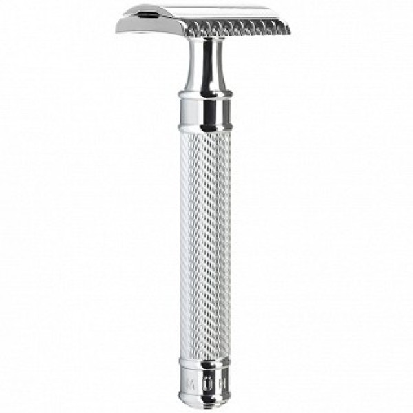 Il Mühle R41 ha l'apertura in tre pezzi, quindi si svita la testa e la si separa in due parti per inserire la lametta.
