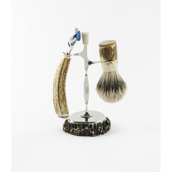 Il rasoio monta la testina gillet fusion e il ciuffo del pennello è in tasso di prima scelta. Entrambi i manici sono realizzati in corno di cervo.
