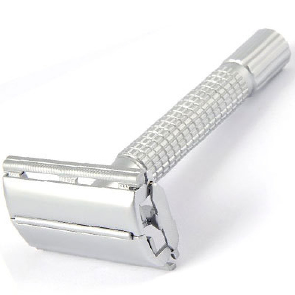Il rasoio Timor ha l'apertura a farfalla, ruotando la parte inferiore del manico si spostano le due alette della testina per poter inserirre la lametta.